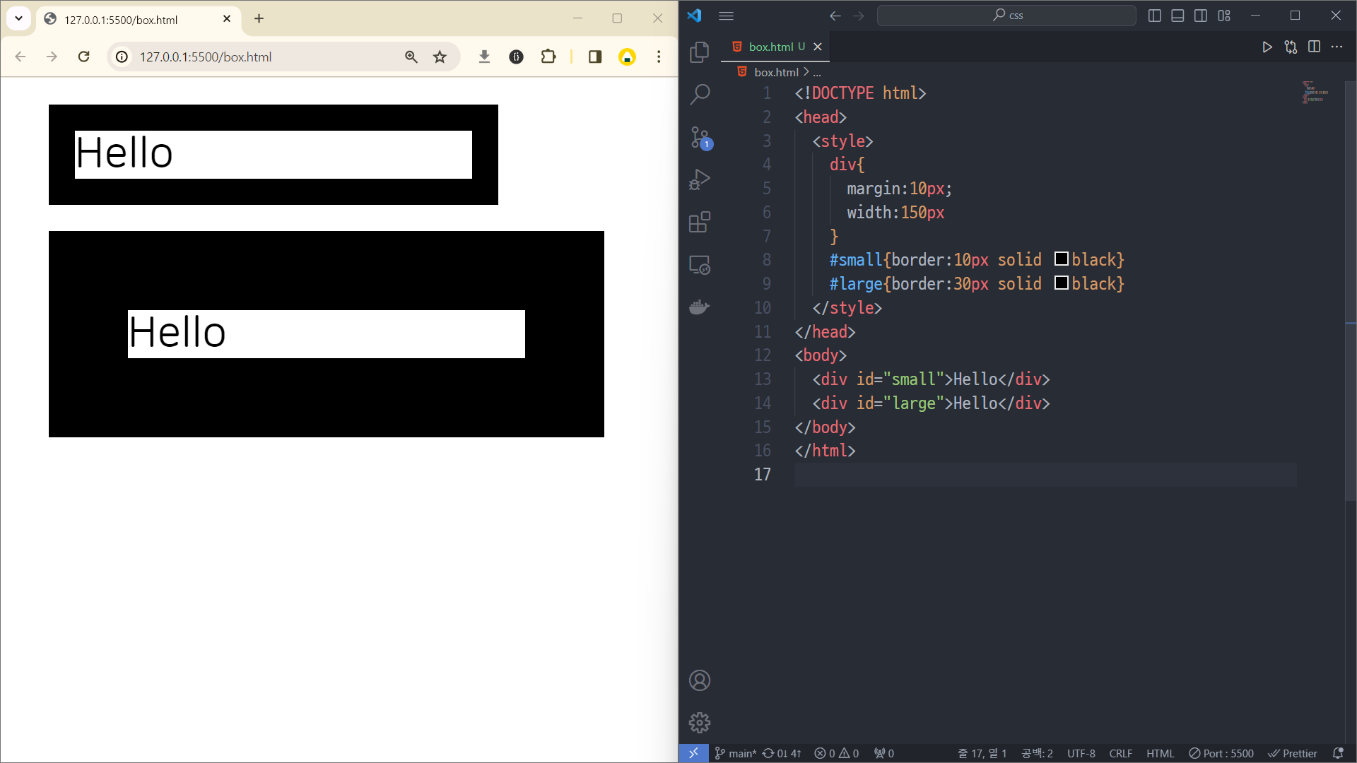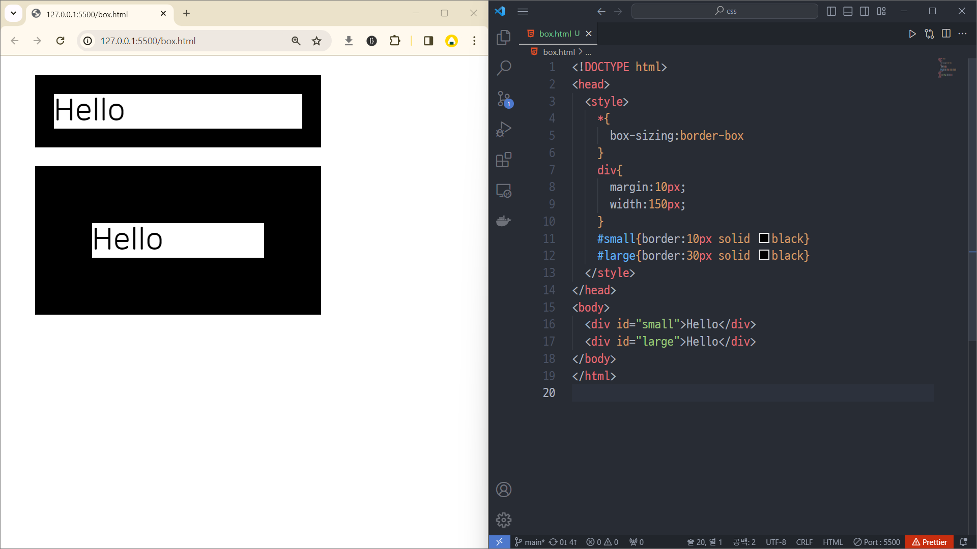 4번 줄처럼 *를 통해 모든 태그에 대해 box-sizing을 border-box로 주면 박스 크기가 달라지는 것을 막을 수 있다.