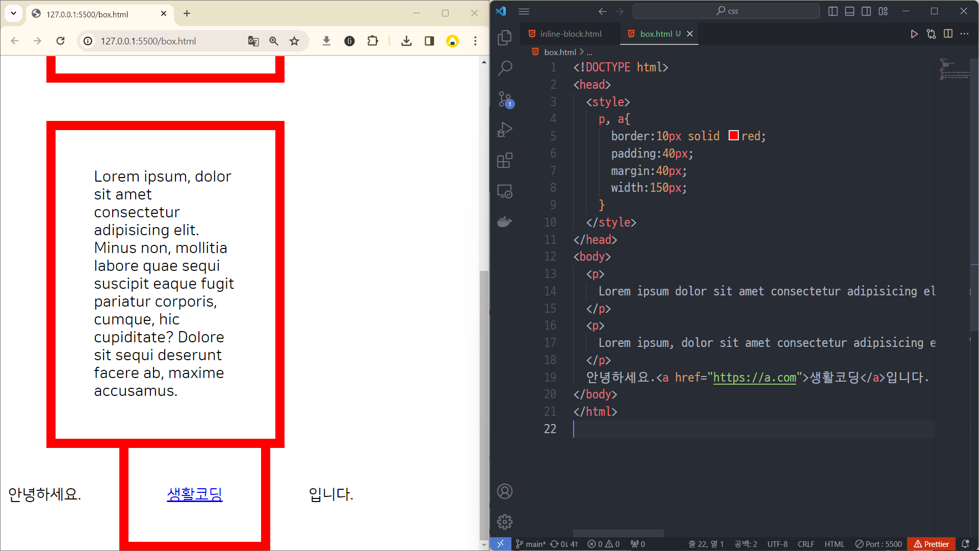 근데 이 박스 모델이 inline element에서는 좀 다르게 동작한다. padding과 margin은 적용되는데, width 값은 무시한다.