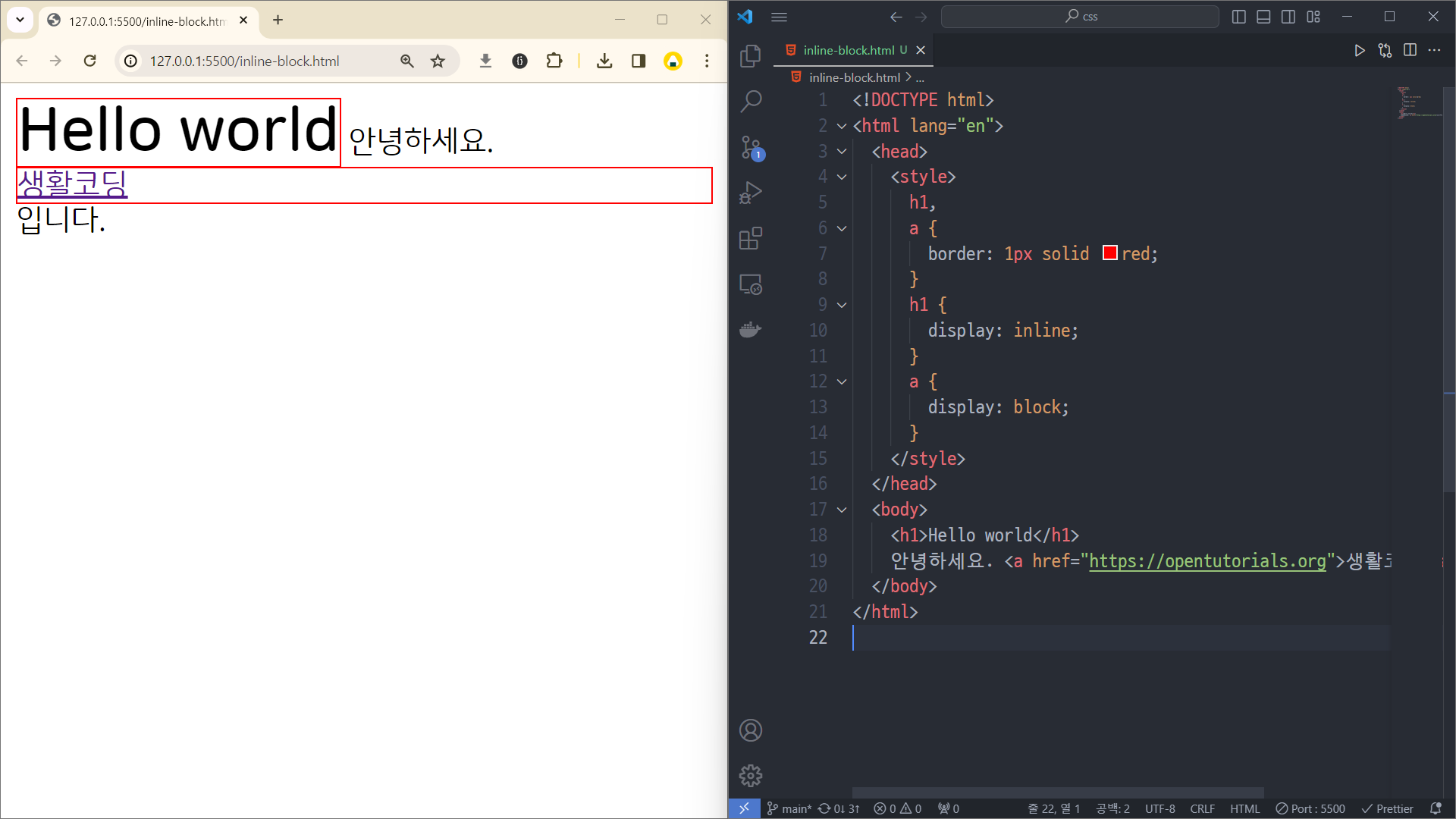 기본적으로 h1 태그는 block, a 태그는 inline임.