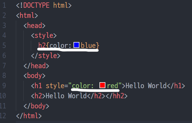 라인5과 라인9의 color:red 부분이 css 코드이다.