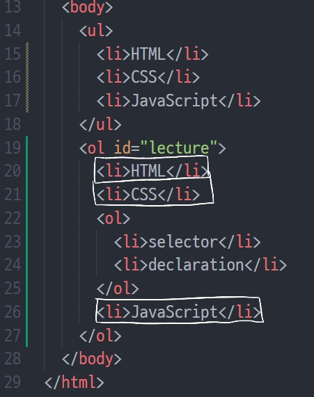 첫 번째는 ul li, 두 번째는 #lecture > li로 할 수 있다.