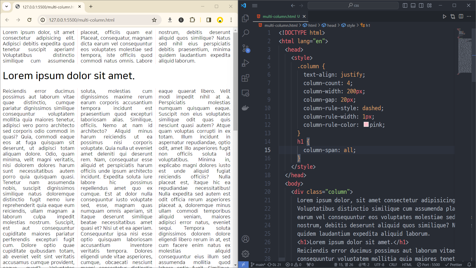 15: h1 태그는 컬럼의 영향을 받지 않도록 만든다. 주로 제목을 표시할 때 사용한다.